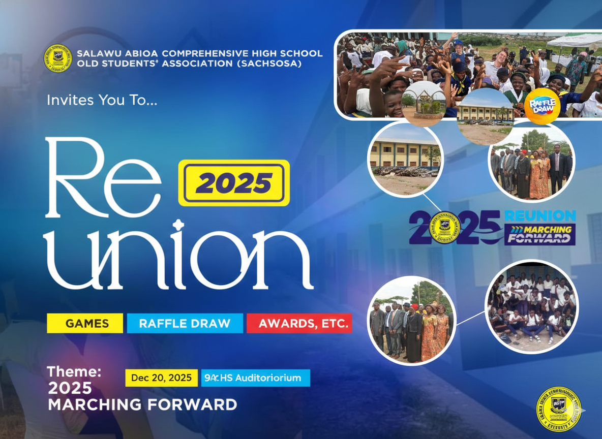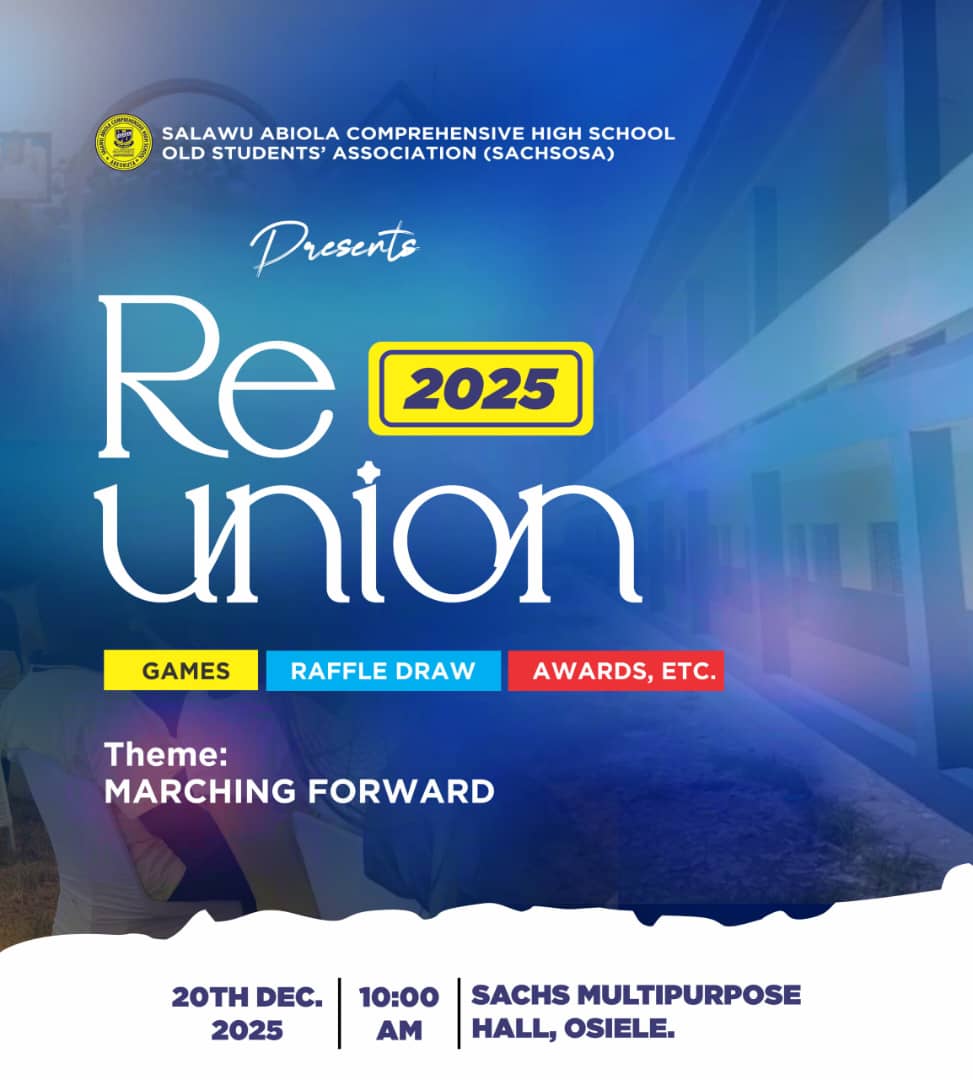 School Auditorium SACHS Osiele, Abeokuta, Ogun State, Abeokuta, Abeokuta, NigeriaTo all distinguished members of the Salawu Abiola Comprehensive High School Old Students' Association (SACHSOSA), The air is already buzzing with anticipation! Based on the spirit and success we've seen in our past gatherings, including the memorable moments captured in our photos, the SACHSOSA Reunion...